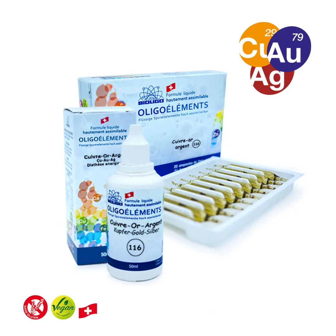 L'argent est un oligoélément complémentaire. En Oligothérapie, l'argent est toujours associé au cuivre et à l'or pour constituer la fameuse association cuivre-or-argent, régulatrice de la diathèse "anergique", chère au Dr. Ménétrier, père fondateur de l'Oligothérapie.