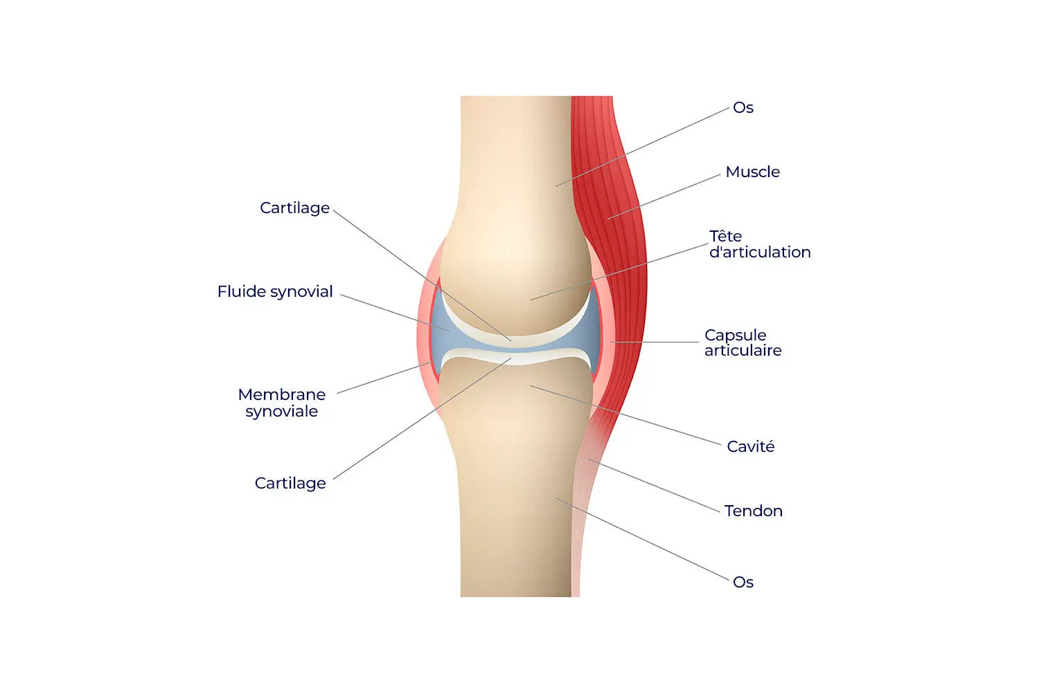 Composé de chondrocytes et d’une matrice extracellulaire, ce tissu est souple et élastique. Il recouvre les extrémités des os et sert de tampon.
