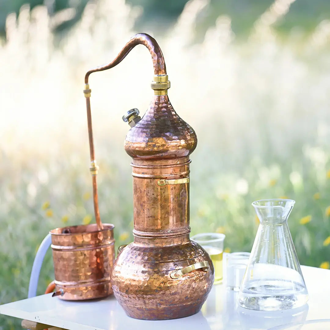 SchaltflächenbeschriftungWasserdampf: Die Pflanze wird in den Destillierkolben mit Wasser vermischt. Die Mischung wird unter kontrolliertem Druck erhitzt, um die Essenz der Pflanze nicht zu verändern. Der Dampf durchströmt den Destillierkolben und wird mit ätherischen Ölen angereichert. Anschließend strömt er durch eine Spirale, kondensiert und wird in einem ätherischen Öltank gesammelt. Der Dichteunterschied zwischen Wasser und Essenz erleichtert die Trennung der beiden Flüssigkeiten: ätherisches Öl und Hydrosol.